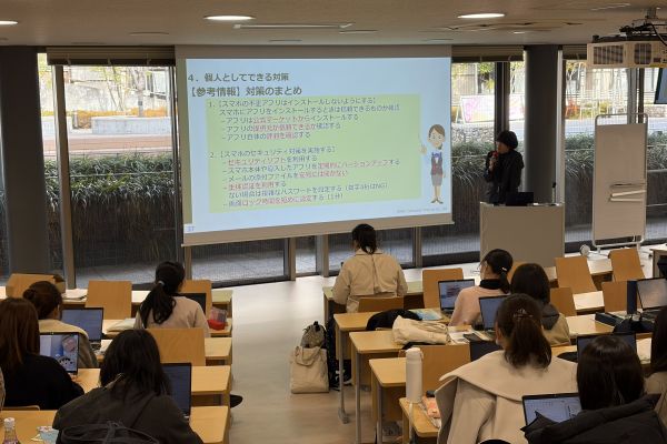 SMBCコンシューマーファイナンス株式会社のご講演では,サイバーセキュリティ統括部 田中様より「個人として注意すべきインターネット犯罪」というテーマで,普段,学生が何気なく使っているインターネットに関する犯罪について丁寧にご講演いただきました.近年のAIの発達により,フィッシング詐欺や不正ログインなどの情報搾取の手口が巧妙化している現状において,被害にあわないために個人としてできる対策について丁寧に解説していただきました.データサイエンスを学ぶ学生としては,データとセキュリティの親和性に気づかされ,普段使っているものが,良くも悪くもいろいろなことに使われていること,技術者としての倫理を知る必要性を思い出させてくれる良い機会となりました.