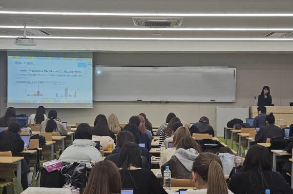 続いて,株式会社マイナビ デジタルテクノロジー戦略本部AI戦略室の羽田野佑奈様より「データサイエンス学部卒業 4 年目のマイナビでのキャリアについて」をテーマにご講演いただきました.講演では,実際のマイナビの業務事例として,MMM(Marketing Mix Model)による広告運用施策について,社内での体制やプロジェクト実施の流れを丁寧にご説明いただきました.また,羽田野様の大学時代の学びとマイナビ社での業務の接続についてもお話しいただき,目的変数(プロジェクトのゴール)の設定やビジネス上では分析手法の条件が満たされないなど大学での学びの限界についてもご説明いただきました.講演の最後には,羽田野様が学生時代にどのような視点で就職活動を進められたのかなど学生にとっても非常に参考になるお話をしていただきました.