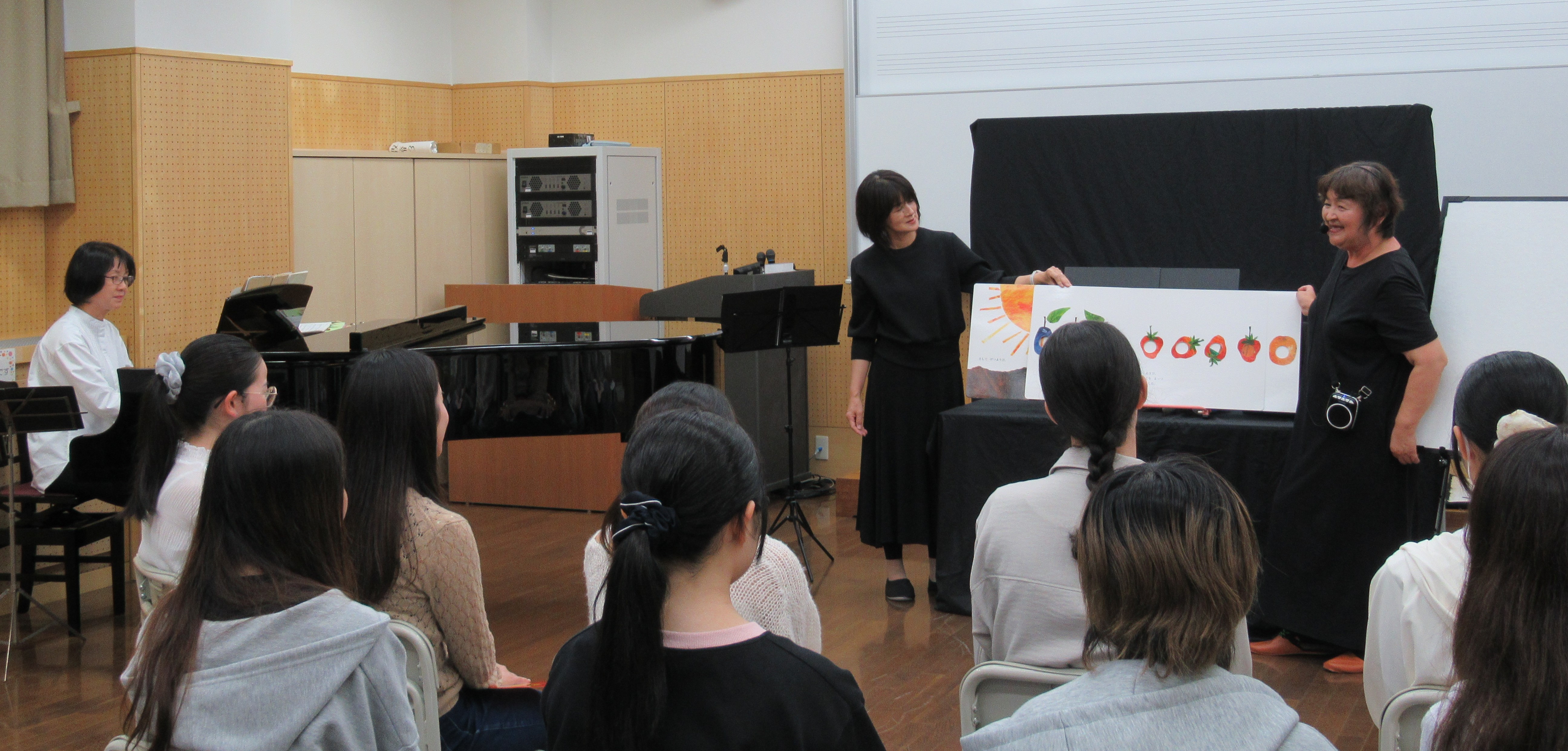 実演は、この夏、市内の児童クラブを廻った際のプログラムをそのまま、たっぷり45分ほどやってくださいました。「へのへのもへじ」の特徴は、ピアノやフルートの生演奏と歌を盛り込んだ絵本の読み聞かせやパネルシアターの上演です。語りに音楽が加わることで、物語の世界が一層色濃くイメージできたり、演じ手と観客を一つに包み込む雰囲気が自然に生まれたりするのを肌で感じ、あっという間の実演ステージでした。