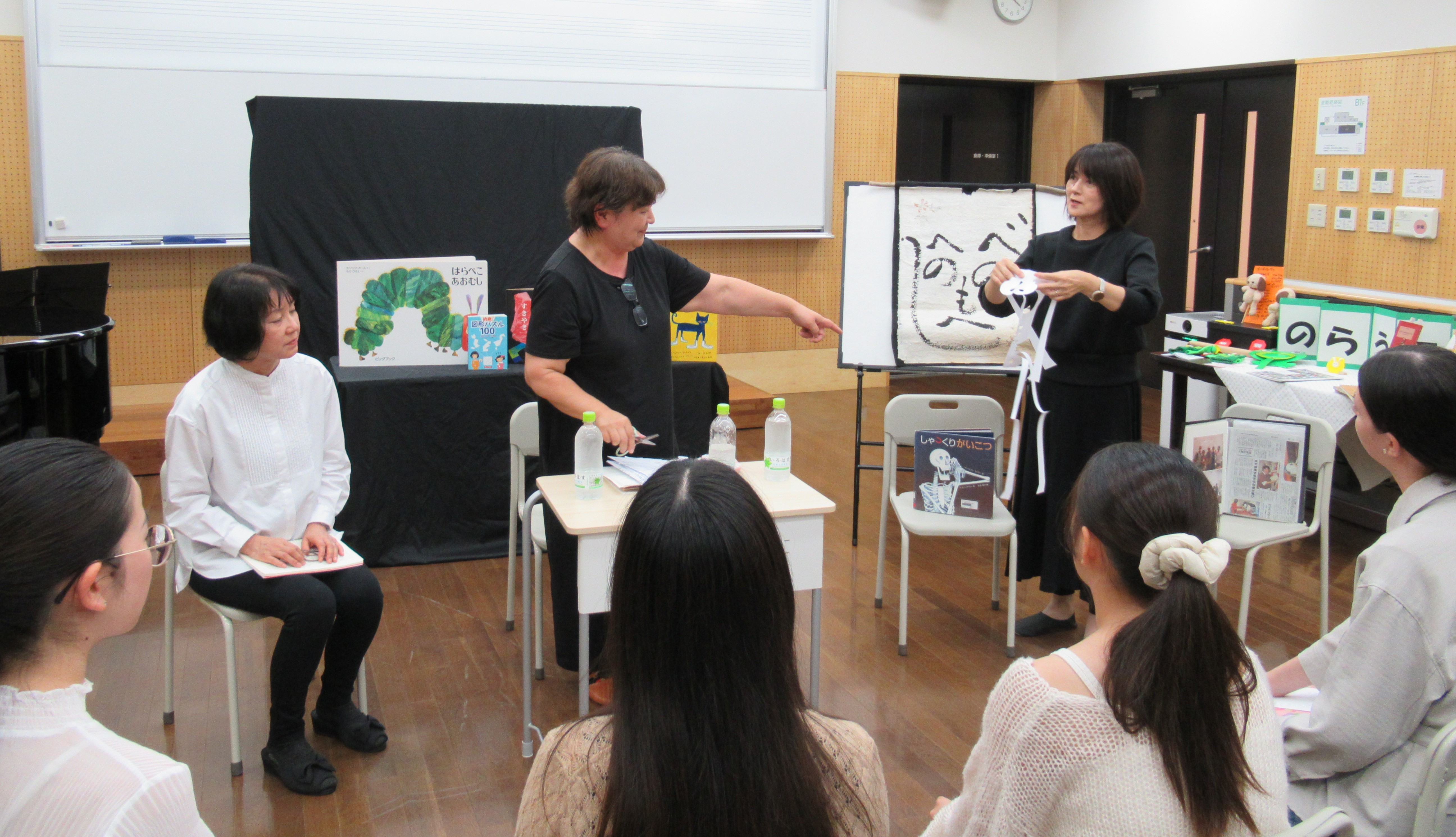 受講生たちはみんな目をキラキラ輝かせて、次々に紹介される絵本の世界を五感を通して感じ味わっていました。「へのへのもへじ」のみなさんも、そんな学生の様子を見て、ますます楽しく演じることができたとおっしゃってくださいました。