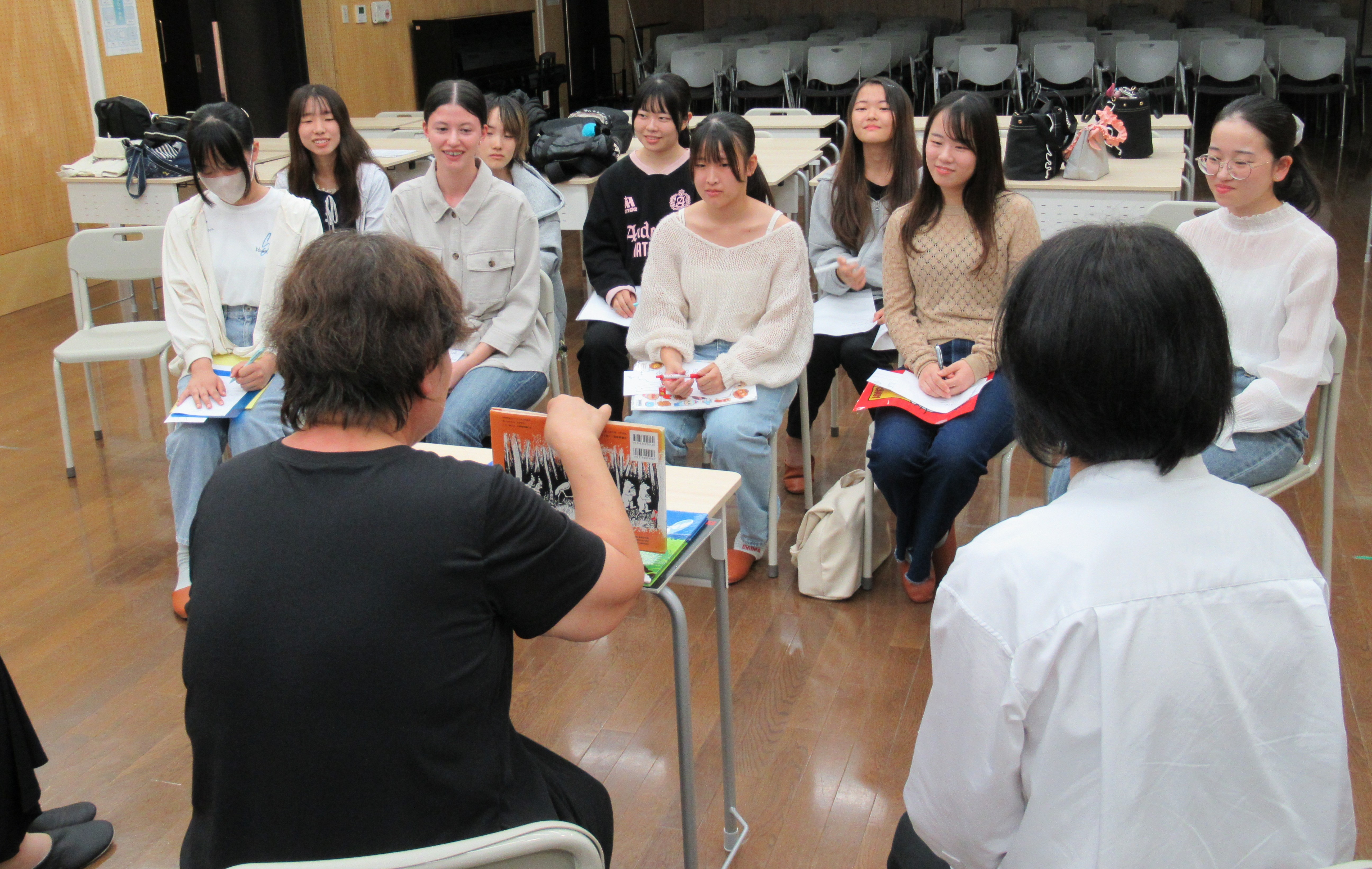 講演では、3人の出会いから「へのへのもへじ」結成、そして、18年間の活動について、それぞれの人生にも触れながらお話ししてくださいました。我が子の通っていた幼稚園の絵本サークルでの出会いをきっかけにグループを結成し、それぞれの得意分野を発揮しながらプログラムを増やしていき、仕事や家庭・子育てもしながらずっと活動を続けてこられたそうです。時には人生における苦しいこともあったそうですが、このメンバーの存在と、この活動を通して出会う子どもたちの笑顔と、そして、この活動が自分自身を楽しく前向きにしてくれることが、18年間やり続け今後もずっとやり通したいと思う要因だと語ってくださいました。「ママ友から、ママがとれて友達になって、今は同志!」という言葉に、学生たちは思わず「かっこいい!」ともらしていました。