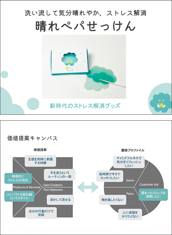 審査員からは、「紙石鹸をストレスケア商品へと昇華させたアイデアが斬新で、非常に優れていた。また、販路計画も着実で実現性が高く、実際に商品化すべき内容である。」とコメントいただきました。