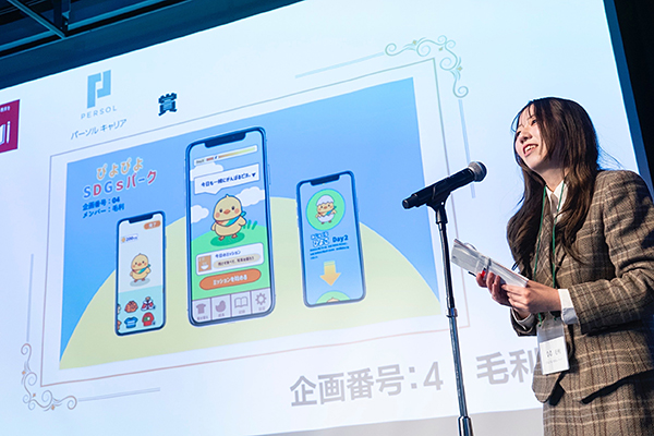 2026年1月17日(土)にSHIBUYA QWS(東京・渋谷)で大学1、2年生向けのSDGsをテーマにしたビジネスコンテストのグランプリファイナルが開催され、「デザイン実習IVB」で毛利奈々さん(2回生)が考案した「ぴよぴよSDGsパーク」が企業賞を受賞しました。おめでとうございます!