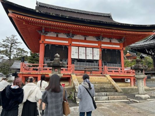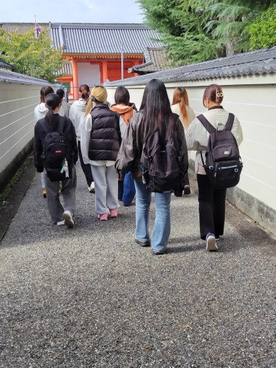 本を置いて、京都の街へ繰り出そう! 学生が企画するフィールドワークを開催 学生の取り組み 2026年度から新たに、文学部共通の京都文化観光学プログラムがスタートしますが、日本語日本文学科では、学内で本を読んで学ぶだけでなく、京都の東山という抜群の立地環境を生かして、できるだけ実地に赴き、その目で見て体感し、理解を深める授業や機会を多く設けています。 その一環として、担当の学生が下見などを行って企画し、希望者が参加する、京都女子大学国文学会「学会ウォーク」を定期的に開催しています。 2024年11月末に開催した「学会ウォーク」では、南禅寺からスタートして永観堂へ、さらには哲学の道を通って法然院を訪れました。仏教文学や、江戸時代の歌舞伎に登場する名所、あるいは文豪の墓所など、日本文学ゆかりの土地をめぐり、教員の解説を聞いて学びながら、東山の紅葉をベストなタイミングで満喫。学生同士や教員との親睦を深めることもできました。