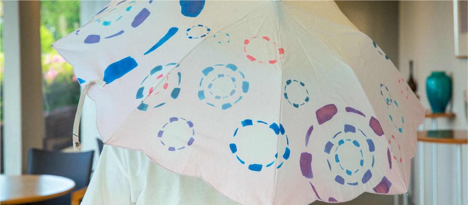 学生からデザインを募集し、その中から選ばれたデザインを地元の企業に協力いただいて作っています。そういった経緯もあってか、オリジナル日傘を使っている学生もたくさんいます。