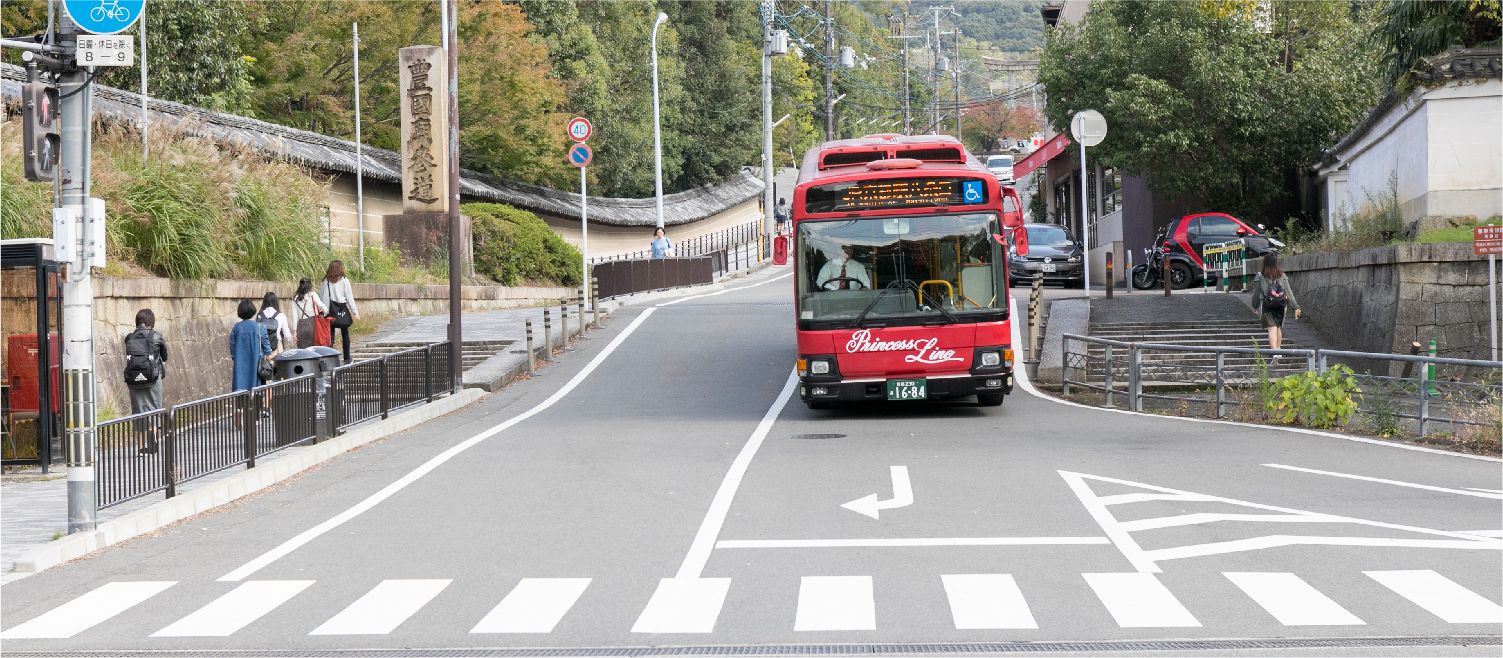 京都女子大学、四条河原町、京都駅を結ぶ、真っ赤なボディが特徴の公共バスです。京女生は「プリバ」と呼んでいます。