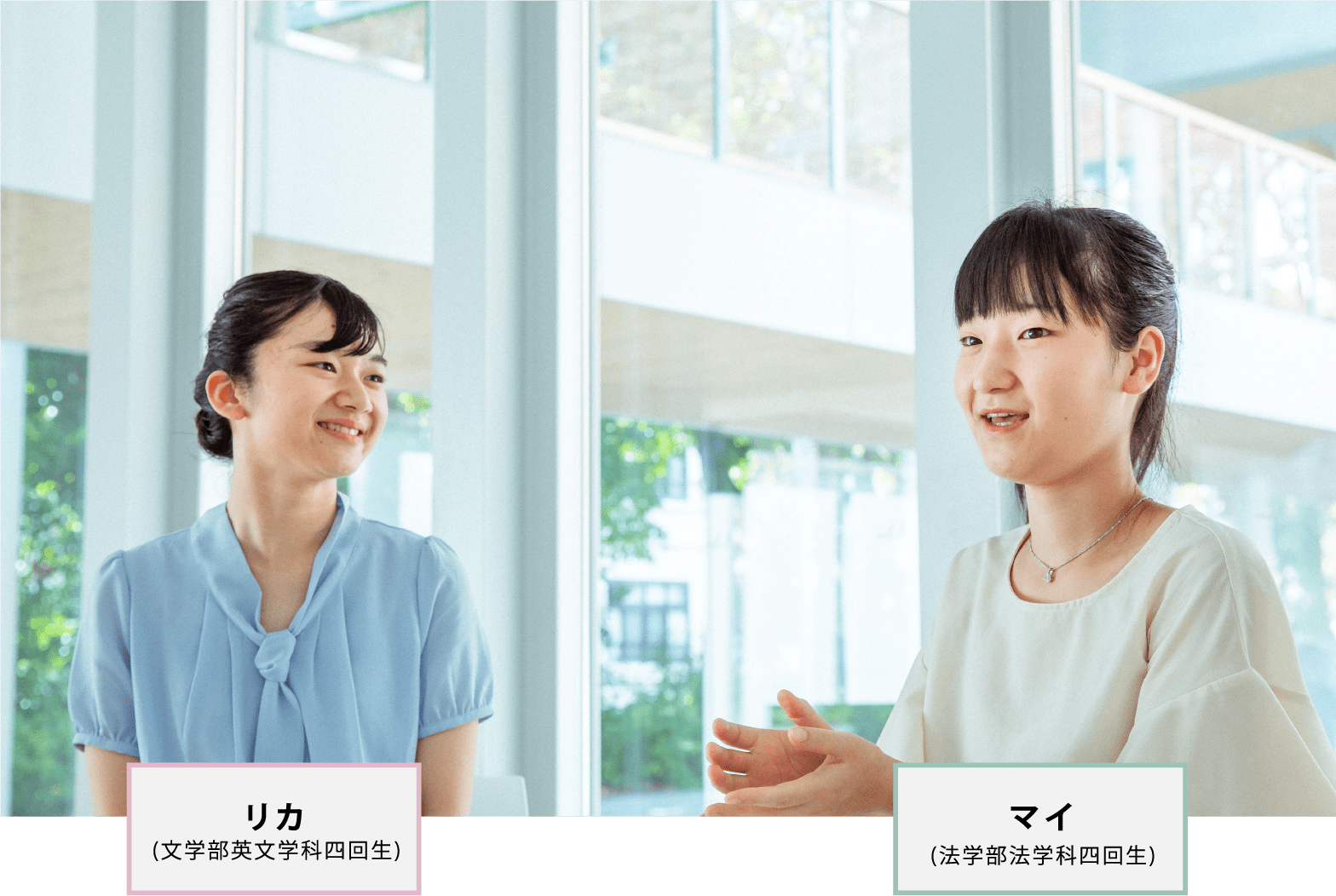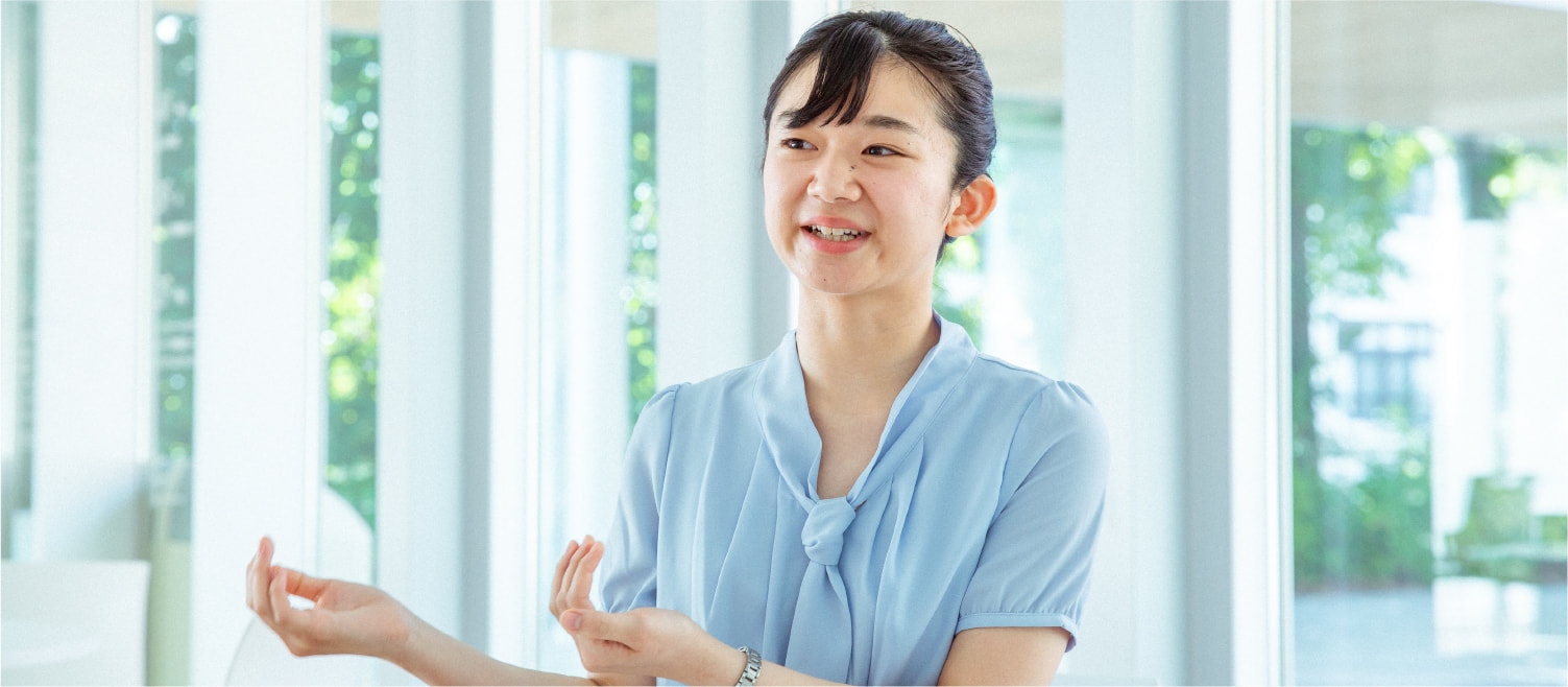 京女の卒業生が働いている会社など多くの企業が、Y校舎や体育館にブースを開いて説明会をしてくれて。そこに先輩方も来られるんですよ。そこで、いろんな話を聞けて。それを聞いて「あ、こういう生き方もあるんだな」と参考になる部分がいくつもありましたし、実際に先輩方とお話できたことで刺激も受けました。私が入社する企業ともこのイベントで巡り会えたんです。