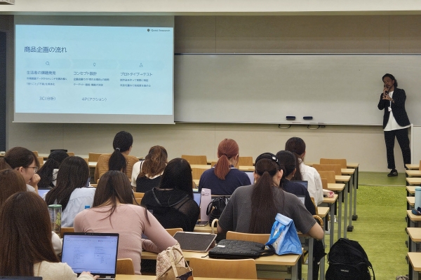第2回講義前半では,株式会社Quest Researchセールス&マーケティング部統括シニアマネージャーの田中周平様より「ヒット商品はどこから生まれる?企画とリサーチの裏側」をテーマにご講演いただきました.田中様の講演では,「商品企画やリサーチの仕事は何か」,「徹底的にリサーチをしても企画した商品が必ずしもうまくいかないのはなぜか」,「リサーチャーと商品企画(マーケター)の役割の違いは何か」など学生への質問を交えながら,順を追ってマーケティング会社における業務等について熱心にご説明いただきました.