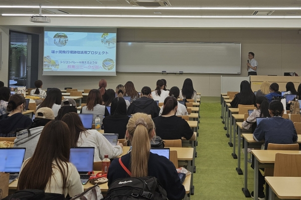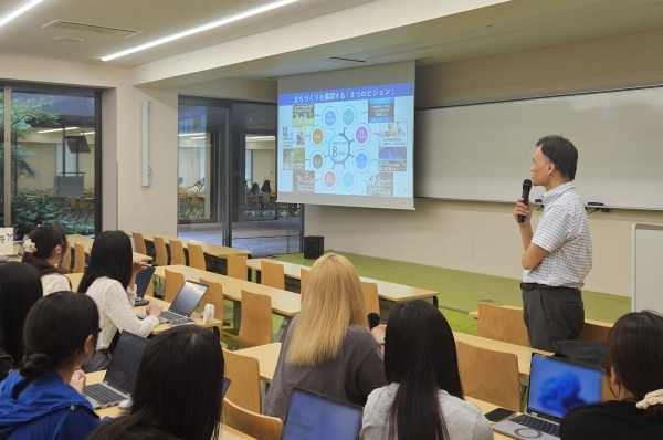講義では,ダッソー・システムズ株式会社パブリックセクター事業開発ディレクターの熊野和久様より「データを活用して未来の都市を考えてみよう」と題しご講演いただきました.最初にダッソー・システムズ株式会社のこれまでの取り組みや京都女子大学データサイエンス学部との連携事業についてご紹介いただいた後,現在,ダッソー・システムズ株式会社が群馬県高崎市で取り組んでいる「堤ケ岡飛行場跡地活用プロジェクト」についてご説明いただきました.