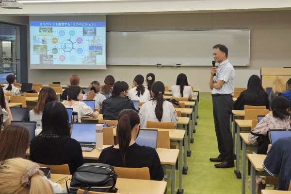 講義の後半では,プロジェクトが実施される群馬県高崎市の特徴や地域が抱える課題などをデータに基づいてご説明いただきました.さらに,「新しいまちづくりを考えるうえで興味・関心のある分野は何か」,「企業誘致をするならどのような分野の企業がよいか」などについて,学生との質疑応答も行われました.
