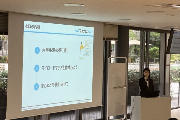 株式会社マイナビのご講演では,就職情報事業本部京都キャリアサポート課 水田様より「【実践ワークで考える】学生生活と進路選択」をテーマに,自身の行動と社会人基礎力のつながりから自分の強みと弱みを明らかにし,改善していく方法についてご講演いただきました.講演の中では,これまでの自身の行動の振り返りからスキルチェックを行い,具体性と期限をもった目標設定を作るワークを行っていただき,自身の強みと弱みと将来なりたい自分との間をどのように埋めていくかの計画の立て方を丁寧に説明いただきました.