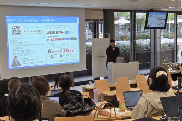 株式会社角川アスキー総合研究所のご講演ではソーシャルイノベーション事業部事業推進部 スタートアップ支援課 松原様より「日本のスタートアップエコシステムのハブASCII STARTUP の取り組み(角川アスキー総研・各種事業から)」をテーマにスタートアップ企業と支援者をメディアでつなぐASCII STARTUP事業の紹介から,スタートアップ企業がつながった結果,どのように価値創造がなされているかを紹介いただきました.特に,コミュニティを創る,醸成することの重要性を事業紹介の具体例を通してご講演いただき,企業だけでなく学生間のつながりの重要性を説明していただきました.