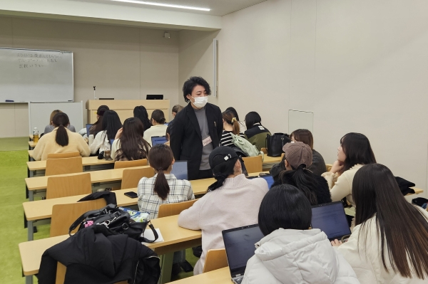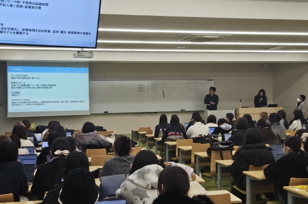 講義の後半では,グループごとのディスカッション内容について発表資料を作成し,代表者が3分程度のプレゼンテーションを行いました.発表では,「男女の賃金格差の是正」といった社会問題や「病院の待ち時間の可視化」,「大学内の食堂の混雑緩和」など学生たちの身近にある課題の解決について発表がなされました.短時間での資料作成となりましたが,講師の皆様からもフィードバックのコメントをいただくことができ,学生らにとっても有意義な講義となりました.