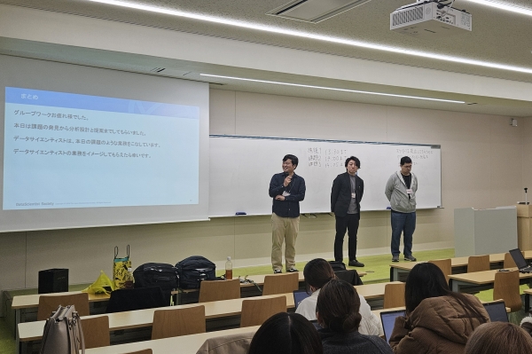 データサイエンス学部専門発展科目「データサイエンス実践概論」では,企業・自治体からゲストスピーカーをお招きし,実際のデータサイエンス活用事例を通じて、大学で学ぶ知識と現場の実践とのつながりについて理解を深めます.第13回(12月23日(火)実施)の講義では,データサイエンティスト協会から3名の講師をお招きし,PBL型の演習を行っていただきました.