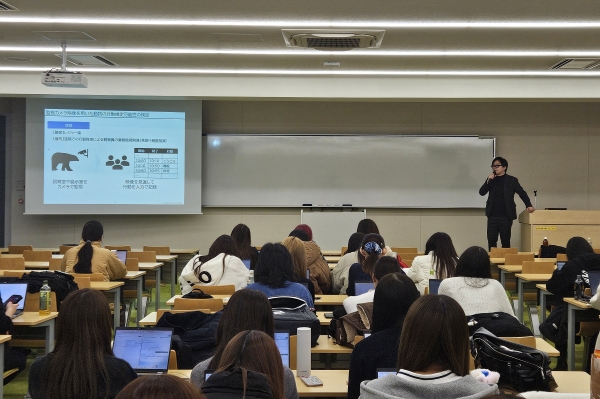 一番目の講演では,株式会社リンクレア経営企画室室長の森高寛子様と同社マーケティング部門オープンデザイン本部の高野祐一様より,「“モデル構築”は業務の1割未満「分析業務のリアル」」と題してご講演いただきました.はじめに,森高様より同社での事業内容,地域創生等の活動についてご紹介いただきました.その後,高野様より講義で扱うデータと企業で扱うデータの違いをもとに現場でのデータ加工の必要性についてご説明いただきました.また,実際の事例として,動物園での監視カメラ映像を用いた動物の行動推定可能性に関する検証について,分析ステップと検証結果を丁寧にお話しいただき,データ加工や分析の中で試行錯誤することの楽しさや新たな発見の喜びなどデータアナリストとしてのやりがいなどもお話しいただきました.講演の最後には,森高様から学生へ向けた激励のお言葉を頂戴しました.