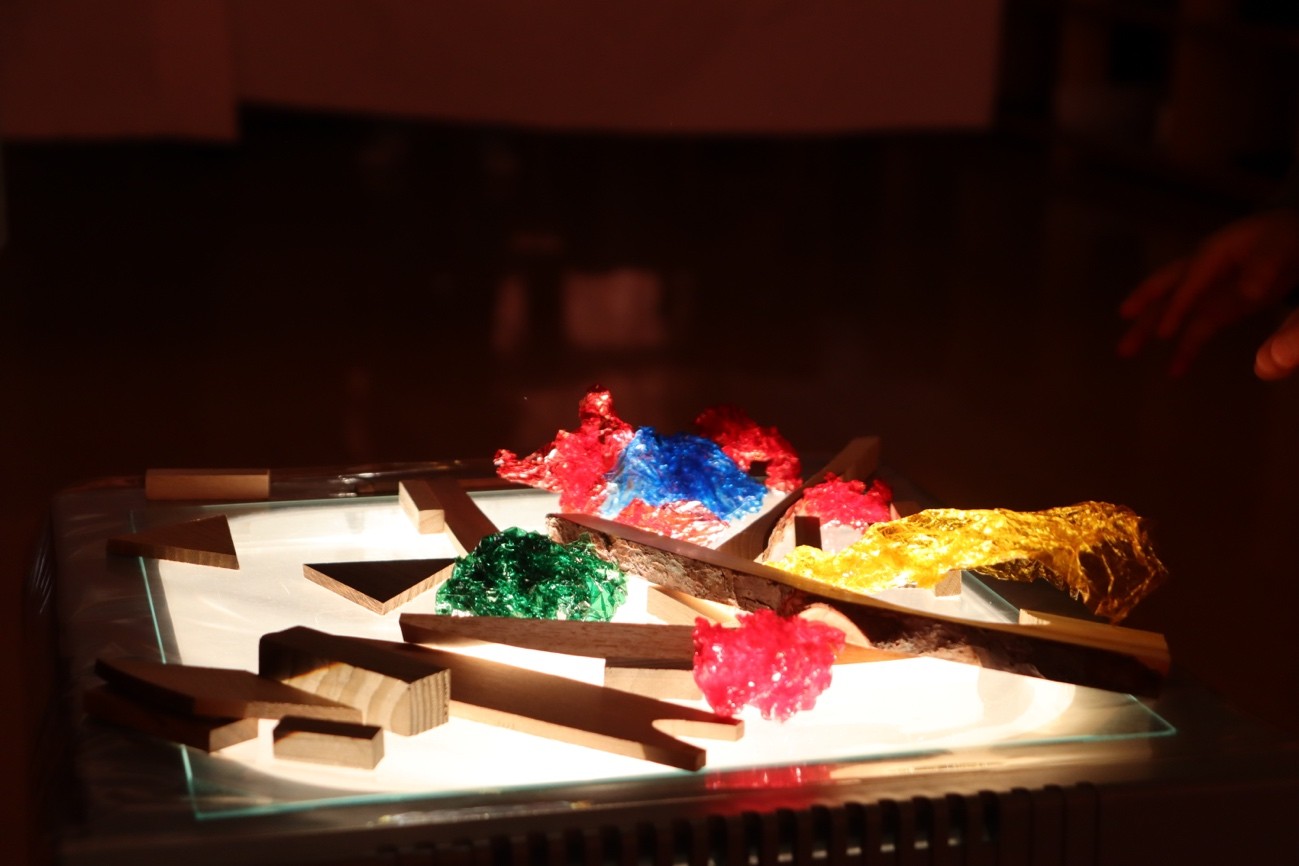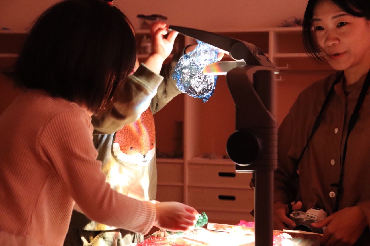 OHPの上に子どもたちがセロファンと木材を載せ、光と影を探究しています -