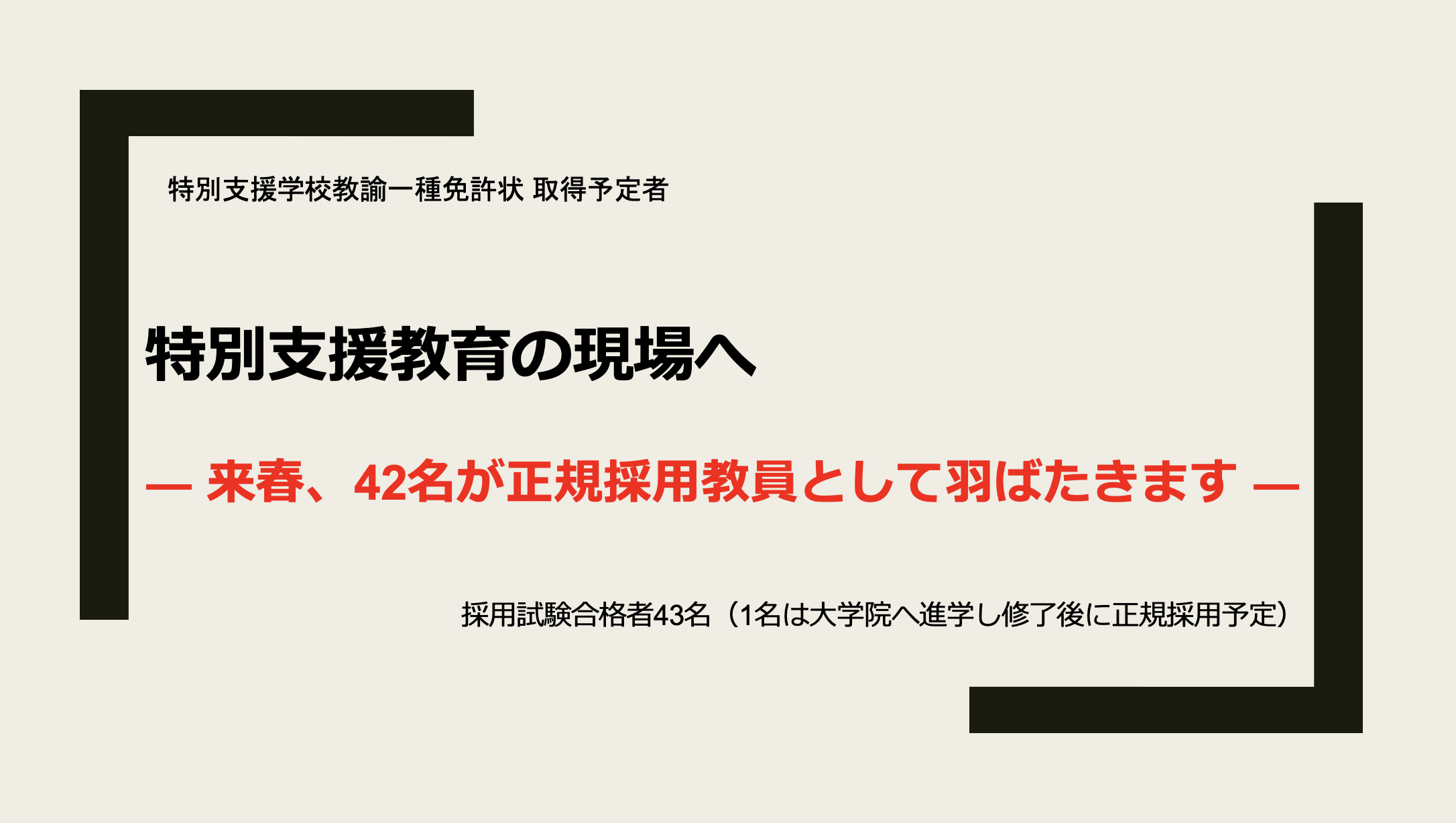 令和8年度教員採用選考試験の結果、4回生の特別支援学校教諭1種免許状取得予定者56名のうち、46名が採用試験を受験し、43名(合格率93%)が合格し、来春4月から教諭として42名が正規採用される予定です(合格した学生1名は、大学院へ進学し修了後に正規採用予定)。