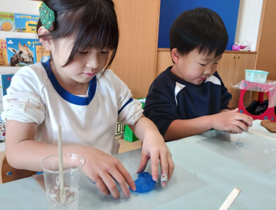 12月16日(火)、京都幼稚園でスライムづくりの出前授業をしました。年長クラスの子ども達が科学、造形、色彩遊びに興味を持って、スライムを作りました。時には、スライムを伸ばしたり、絵具を混ぜて色の変化に気づいたり、ビーズを入れて花を作ったり、楽しみながら活動しました。幼稚園の科学遊びが、子ども達にどのような学び、気づきがあるのかを研究しています。