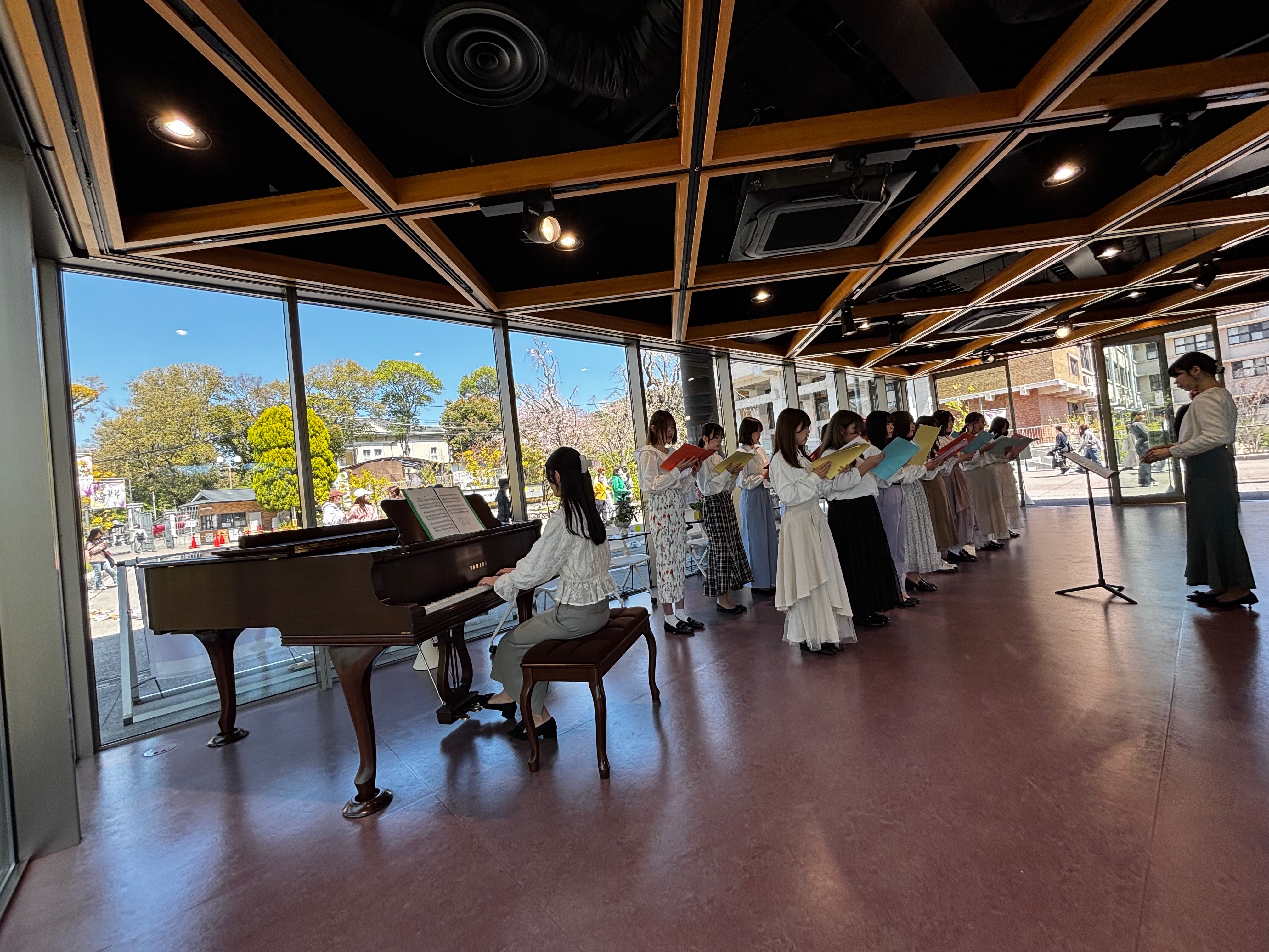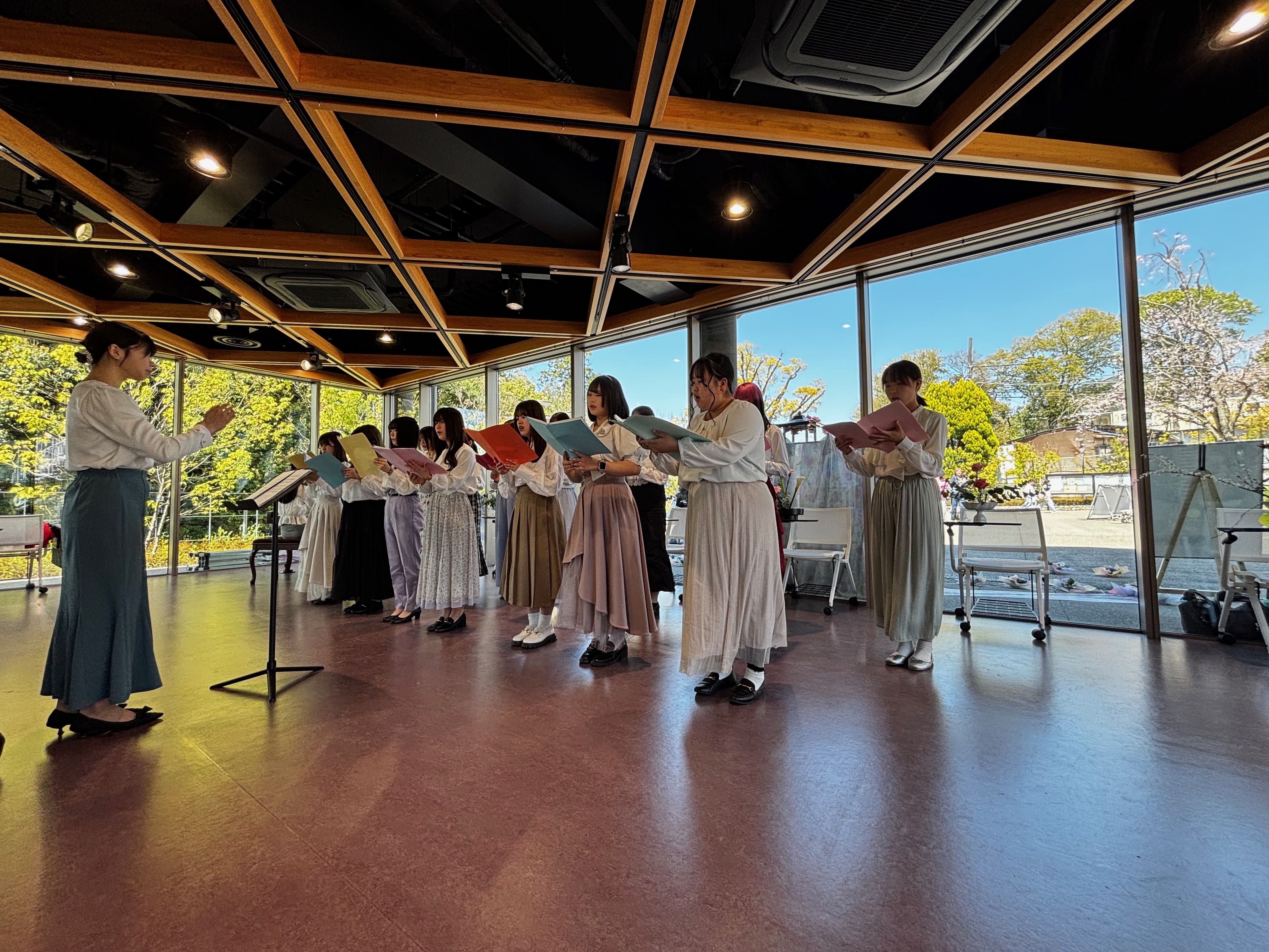 学生たちは、本番に向けて授業開始前の時間も活用しながら練習を重ねてきました。学年を越えて声を掛け合い、よりよい演奏を目指して心を一つに取り組んできた成果を、当日無事に披露することができました。当日は晴天にも恵まれ、花まつりにふさわしい穏やかであたたかな雰囲気の中で、来場された皆さまに演奏をお届けすることができました。また、お忙しい中、演奏を聴きに来てくださった皆さまに心より感謝申し上げます。皆さまのあたたかなまなざしと拍手は、学生たちにとって大きな喜びと励みになりました。