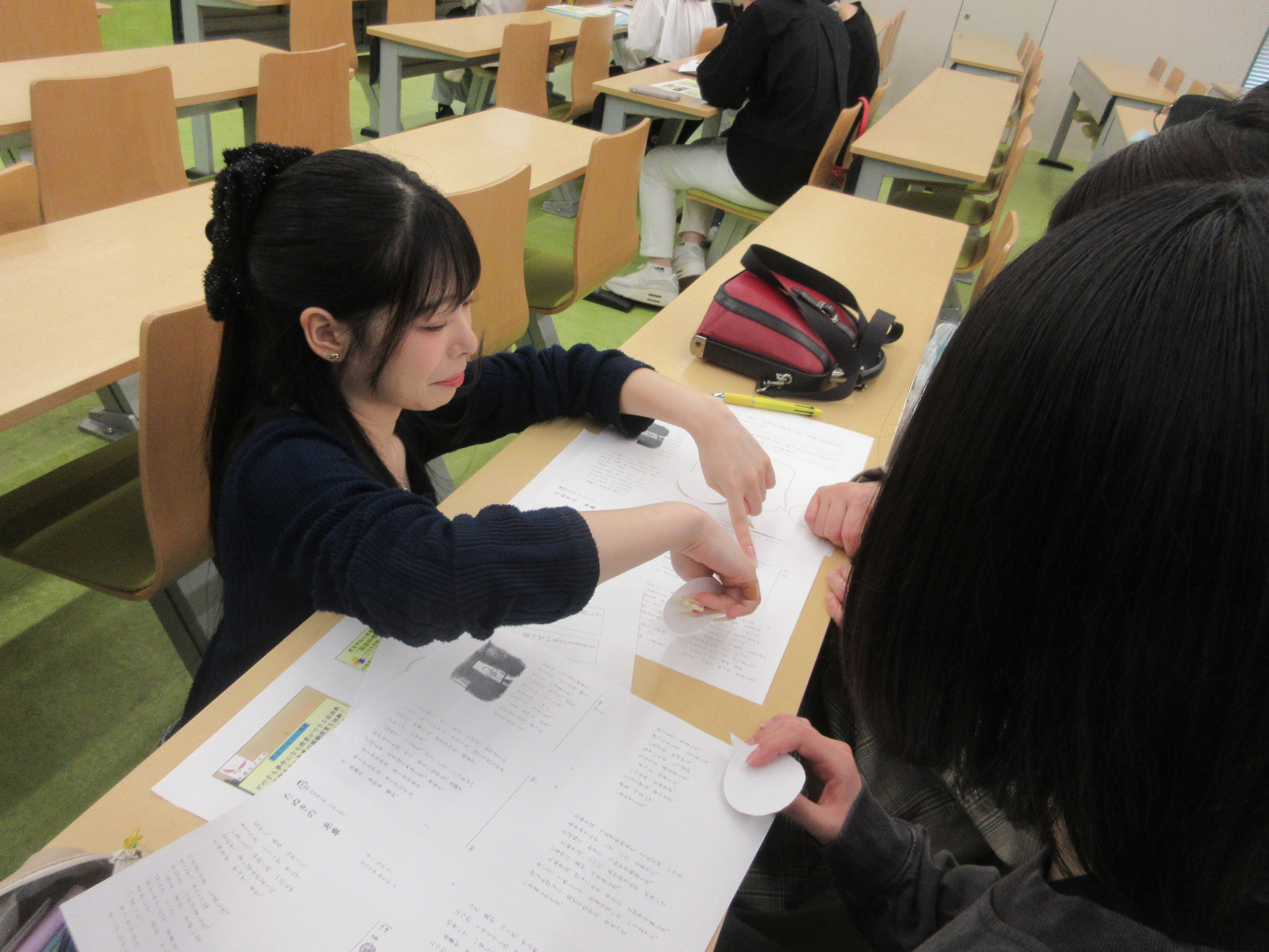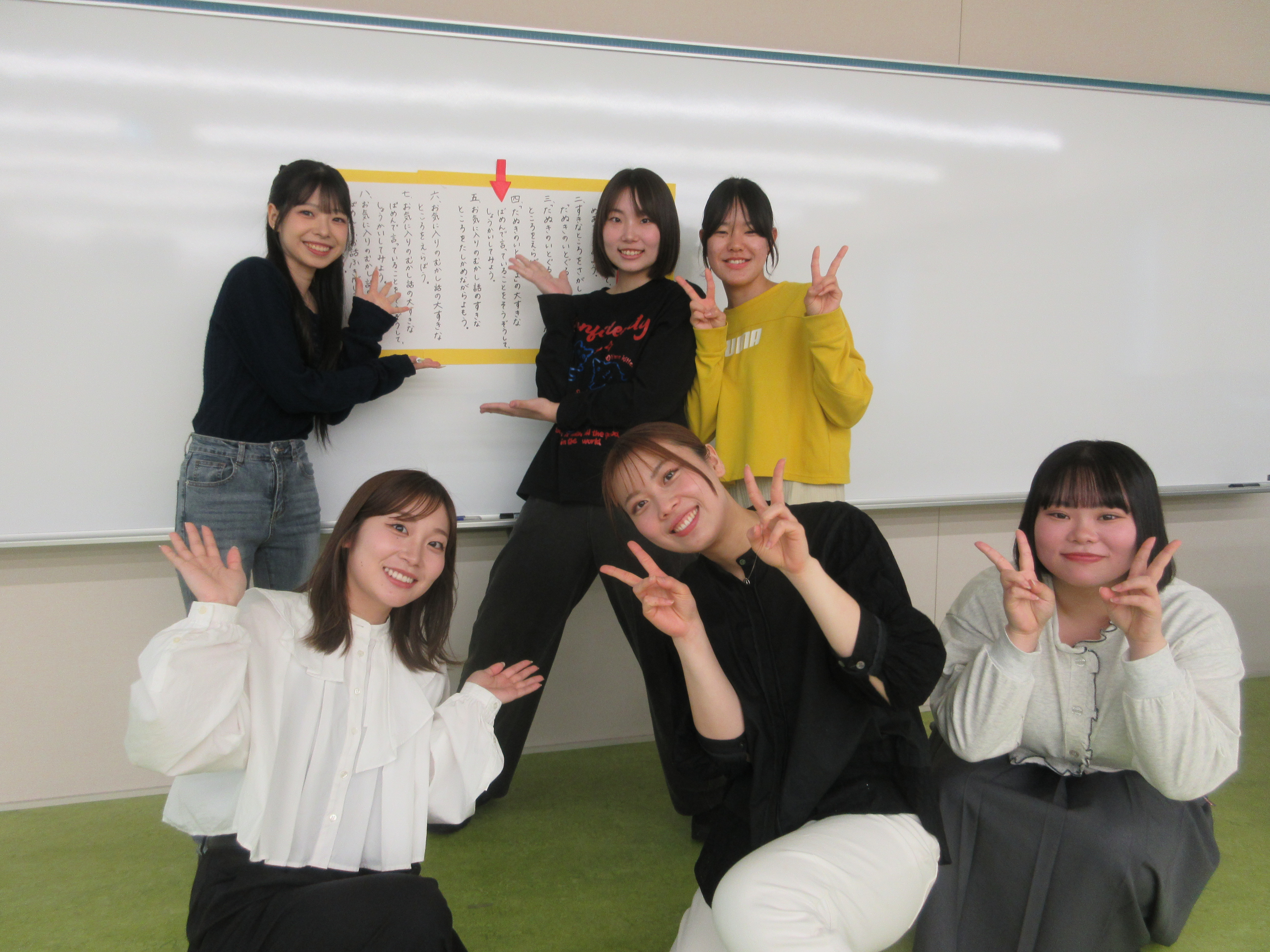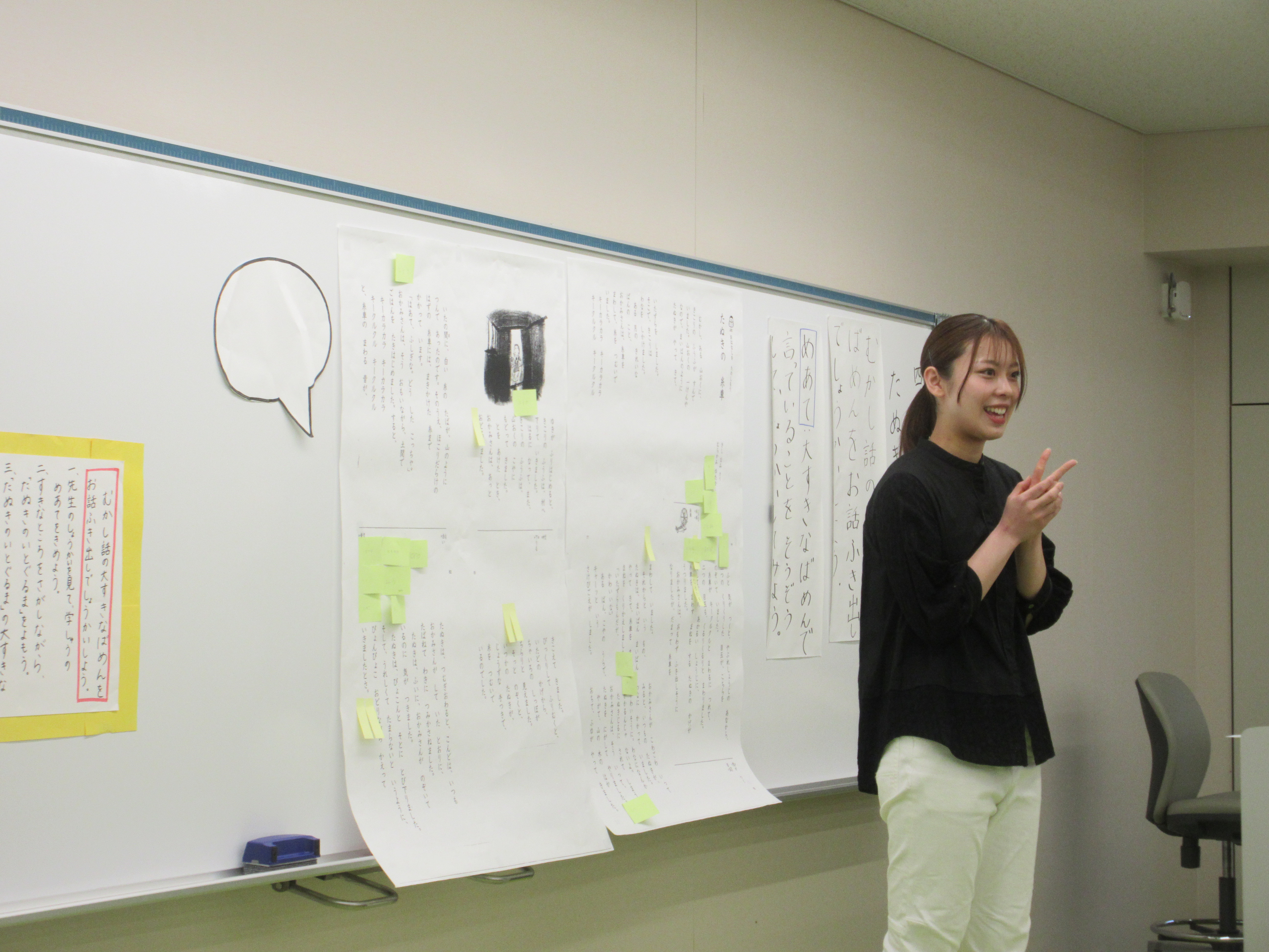 4月26日(日)のオープンキャンパスミニ講義では、今年も国語教育ゼミ4回生の皆さんが小学校教師役になり、ご来場の高校生、引率者の皆様を児童役に見立てて、小学校1年生の国語科の授業「大好きな昔話を『お話吹き出し』で紹介しよう」に挑戦しました。当日は、ペア交流のモデル動画や登場人物の会話の想像を誘発するための「お話吹き出し」の活用など、子供たちが主体的に取り組める様々な手立てを駆使して模擬授業を進めました。初めて出会った高校生の皆様がペアになり、吹き出しを使って物語の世界にひたって交流する姿が印象的でした。