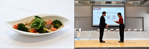 受賞メニューは、「お茶だしを使った和風アクアパッツァ」です。洋風料理として知られるアクアパッツァを和風にアレンジし、出汁に緑茶を用いた独創的な一品です。緑茶やトマトに含まれるうま味成分を活かすことで、減塩しながら満足感のある味わいを実現しました。