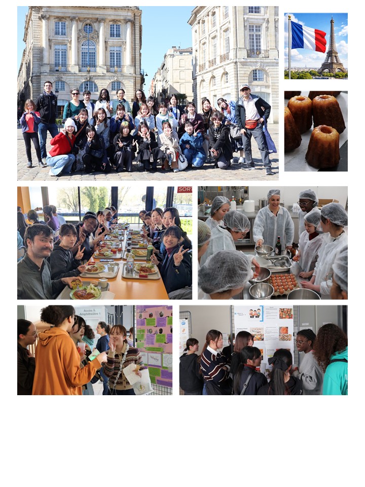 2026年3月後半に10日間の研修旅行を行いました。昨年が初回で、今回が第二回です。本学食物栄養学科の学生16名と教員2名(辻 雅弘と松本晋也)でパリとボルドーを訪問しました。ボルドーINP(工科大学)では、ボルドー発祥であるカヌレを作製すると共に市販品との食べ比べを行いました。本学の学生が7班に分かれて、日本の食文化や栄養学的効用などを英語でポスター発表し、INPの教授および辻・松本教授がそれぞれの研究成果を講演し、議論しました。ボルドー大学Neurocampusでは神経科学の研究所を見学しました。 INPのClementine教授とその学生がボルドー市内や近郊のワイナリーやチョコレート工場などを案内してくださり、貴重なフランス食文化体験となった上に、現地学生とも密に交流でき、充実した研修旅行となりました。
