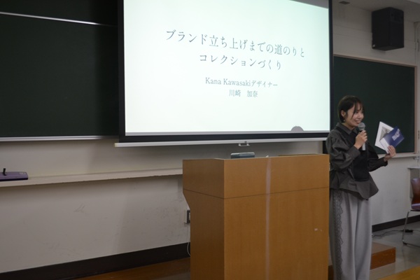 生活造形学科卒業生でファッションデザイナーの川崎加奈さんが、ファッションデザイン学ゲストスピーカーとして講演