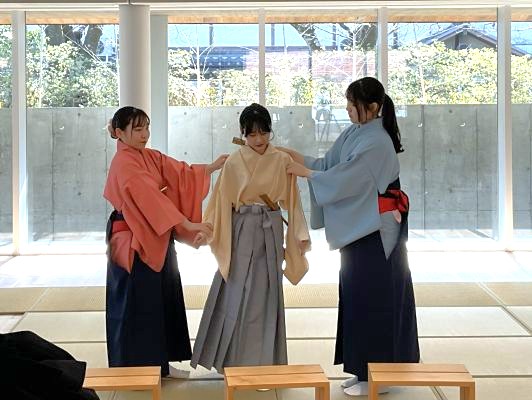 狂言を実際に演じる授業 伝統芸能に親しむ 「国文学特殊講義3B」の授業では、受講生が狂言《口真似》の実演に取り組みます。グループに分かれて、半年間で仕上げた成果を公開発表。難しい狂言独特の台詞や所作を覚え、3人の息をぴったりあわせるために練習を重ね、チームワークを育みます。観るだけではなく実際に演じることで、「狂言」の本質と、奥深さを理解し、研究に生かすことができます。