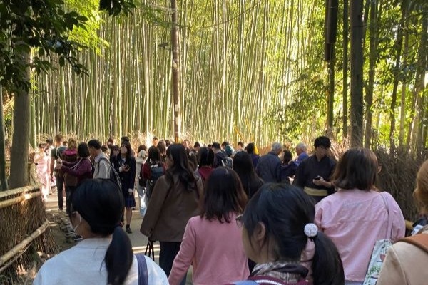 観光客で混み合う竹林の小道。 -