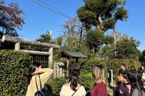 当日は清々しい秋晴れの中、『源氏物語』の舞台にもなった清涼寺や野宮神社、江戸時代の俳諧師、芭蕉の門人である去来の庵、落柿舎に立ち寄り、同行した学科の教員が文学にまつわる解説を行いました。また、天龍寺の庭を散策、嵯峨嵐山文華館では百人一首の歴史に触れるとともに、学生おすすめのスポット「御髪神社」を訪れるなど、京都の魅力を再発見した秋の一日となりました。