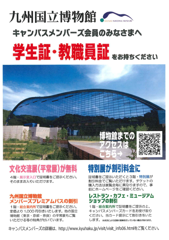 学生証を提示することで、東京国立博物館と九州国立博物館の平常展が無料になるほか、様々な割引特典があります。