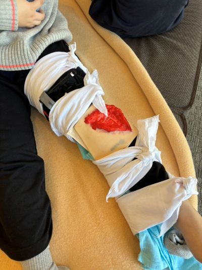 ・一次救命処置、止血法や包帯法など授業で習っていたにも関わらず忘れていた内容が多かったけれど、学科の講義と併せて実技による演習の中で丁寧に一人一人指導してくださったので、処置の方法をしっかりと身に付けられたと思うし、すごく自分にとって学びの多い貴重な時間だった。