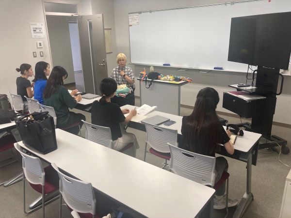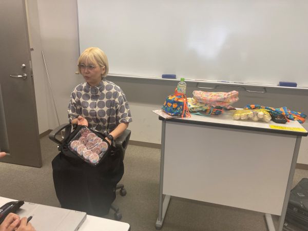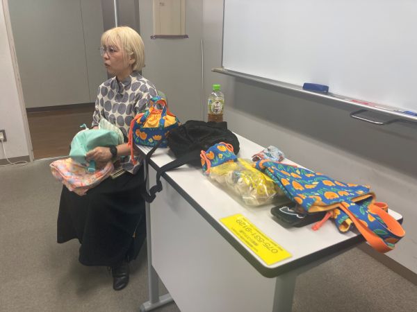 現代社会学部3回生「社会調査実習Ⅱ」佐藤クラスは、伏見桃山手芸教室テヅクリの北村さんのご協力を得て、9月29日(月)にワークショップを開催しました。今回は、北村さんが手芸教室で指導されている入園・入学グッズ、個人的に創作されている推し活用バッグなどを手に取りながら、これまでの手芸との関わりについてお話しいただきました。また、各学生が自身の手芸経験や手仕事に関連する文献調査・フィールドワークでの所感を話しつつ、これらから生まれた問いをもとに、北村さんに向けてインタビューを行いました。
