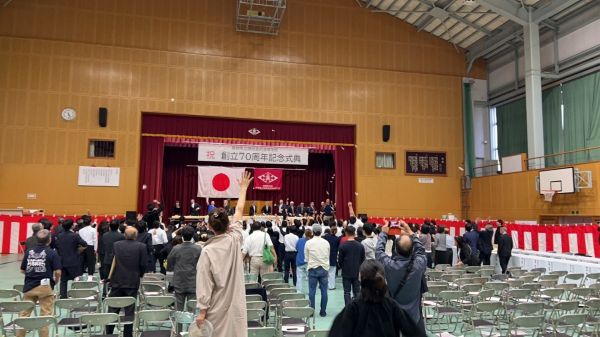 きんにゃもにゃセンター(通称きんせん)で島根県立隠岐島前高校創立70周年記念式典のポスターを見つけた。部外者が70周年の記念式典に参加してもよいのだろうかと躊躇していた。隠岐神社の宮司さんでもあり、海士町観光協会理事長も務めておられる村尾茂樹さんに後鳥羽上皇記念館の館内を案内してもらった。村尾さん彼自身は、松江の高校に進学したが、そのころの島前高は廃校寸前だったそうだ。「ぜひ隠岐島前高校70周年記念式典に行ってください。娘が民謡で、笛を吹くので、見に行ってやってよ。大雨だけん、見に来る人も少なくなるだろうし、ぜひぜひ」と進めて下さった。さらに、記念館の受付の女性が隠岐島前高校出身で「餅投げもあるから、ぜひ」と言われた。