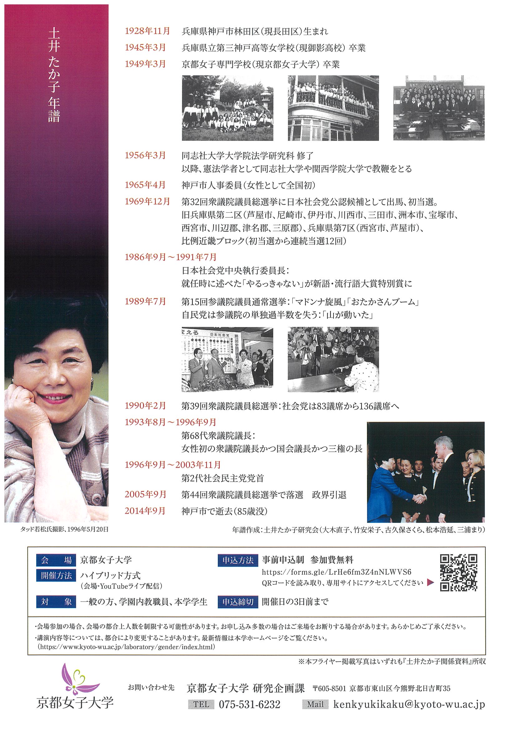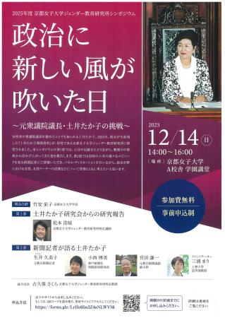 女性初の衆議院議長をつとめたことでもしられる土井たか子。2024年、彼女が生前残した「土井たか子関係資料」が、母校である京都女子大学ジェンダー教育研究所に移管されました。本シンポジウムの第1部では、土井の足跡をたどりながら、整理中の資料から浮かび上がってきた姿を報告します。第2部では往時の土井の様々なエピソードを知る新聞記者にご登壇いただき、パネル・ディスカッションを行いながら、政治分野における女性、女性リーダーの役割などについて皆様とともに考えたいと思います。