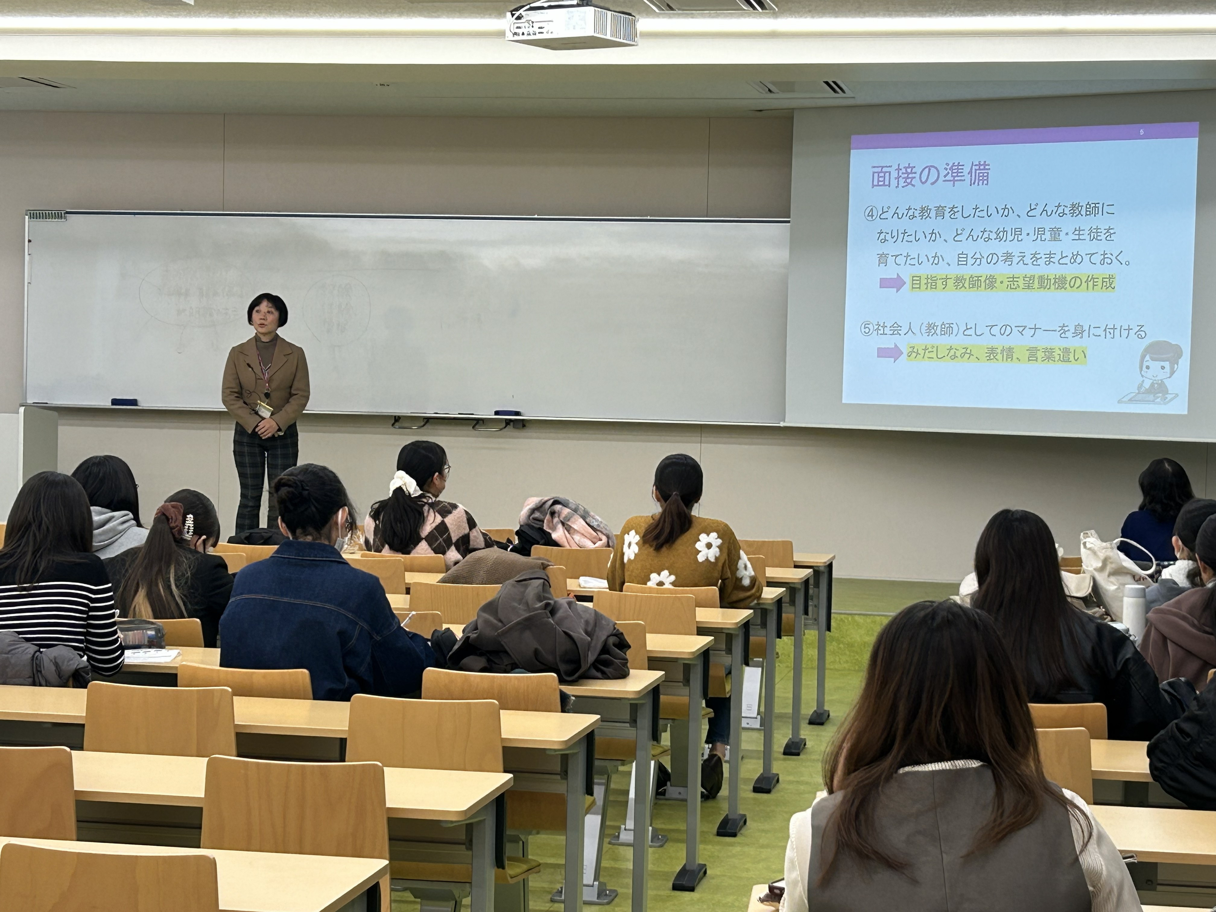 12月11日(木)に、来年度以降に教員採用試験を受験予定の1回生~4回生を対象に「第7回教職応援セミナー」を開催しました。参加者は42名です。今回のセミナーでは、令和8年度の教員採用試験・人物評価試験について、これまでの教職応援セミナーの内容(自己分析や自治体研究等)を振り返り、個人・集団面接、集団討論、模擬授業に関するポイントや気を付けるべき点を伝えました。来年度の教員採用試験に向けて、応援するとともに地道な取り組みを願っています。