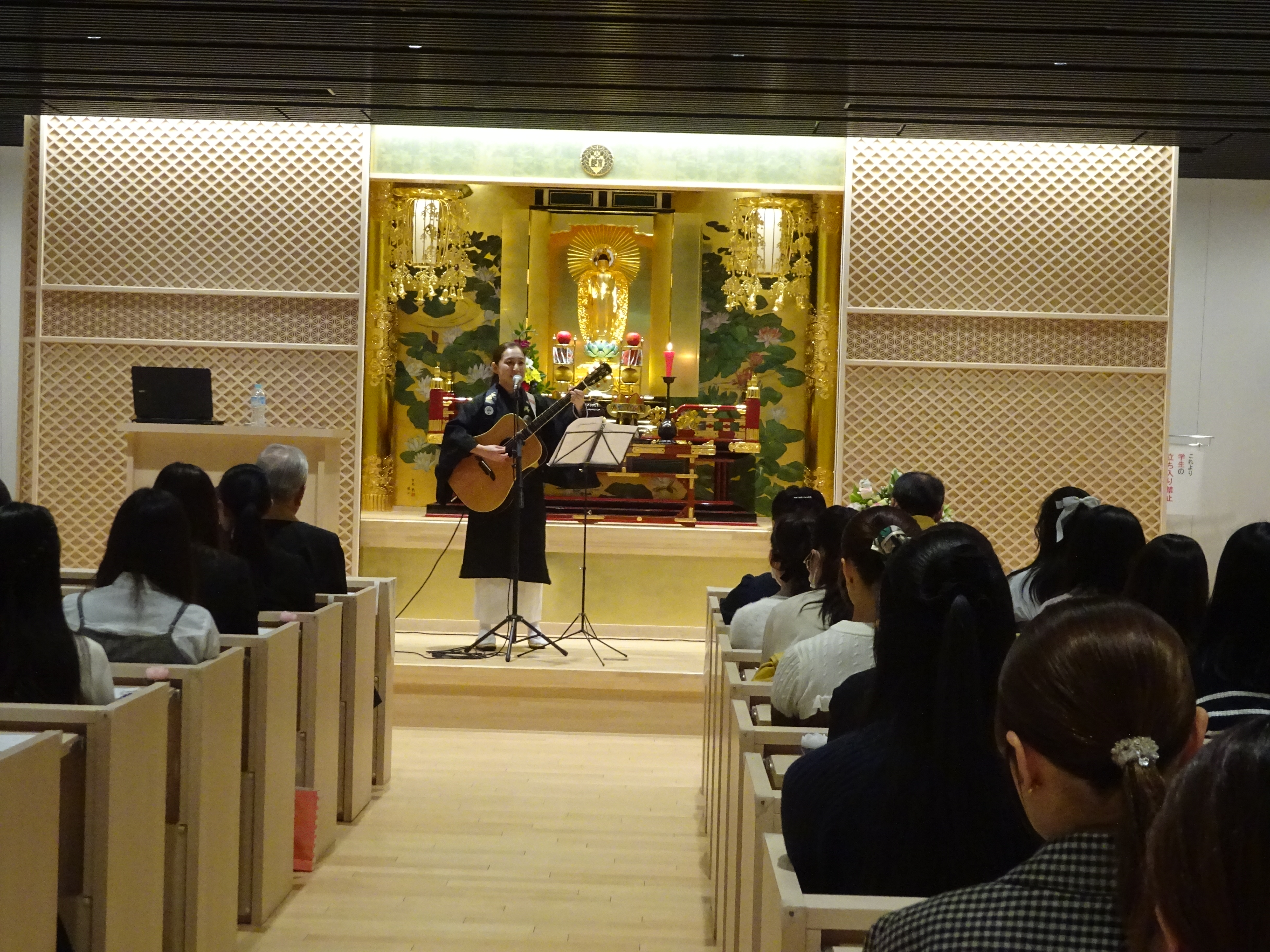 第一部では、仏前の灯が参加者一人一人の手元まで届けられ、厳かな雰囲気のなかで礼拝をおこない、二十歳となった慶びを仏前に報告するとともに、お世話になった方々への感謝の気持ちを新たにしました。その後の記念講演では、龍王山光明寺住職であり、シンガーソングライターの 三浦 明利氏をお招きし、『ありがとう~私を包むすべてに~』というご講題でお話と歌を聴かせていただきました。