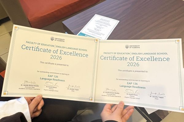 8月からカナダのアルバータ大学に留学中の英語文化コミュニケーション学科2回生の赤井さんが、クラス内や課外活動での積極的な姿勢が優秀な生徒に選ばれ、教育学部より表彰されました。