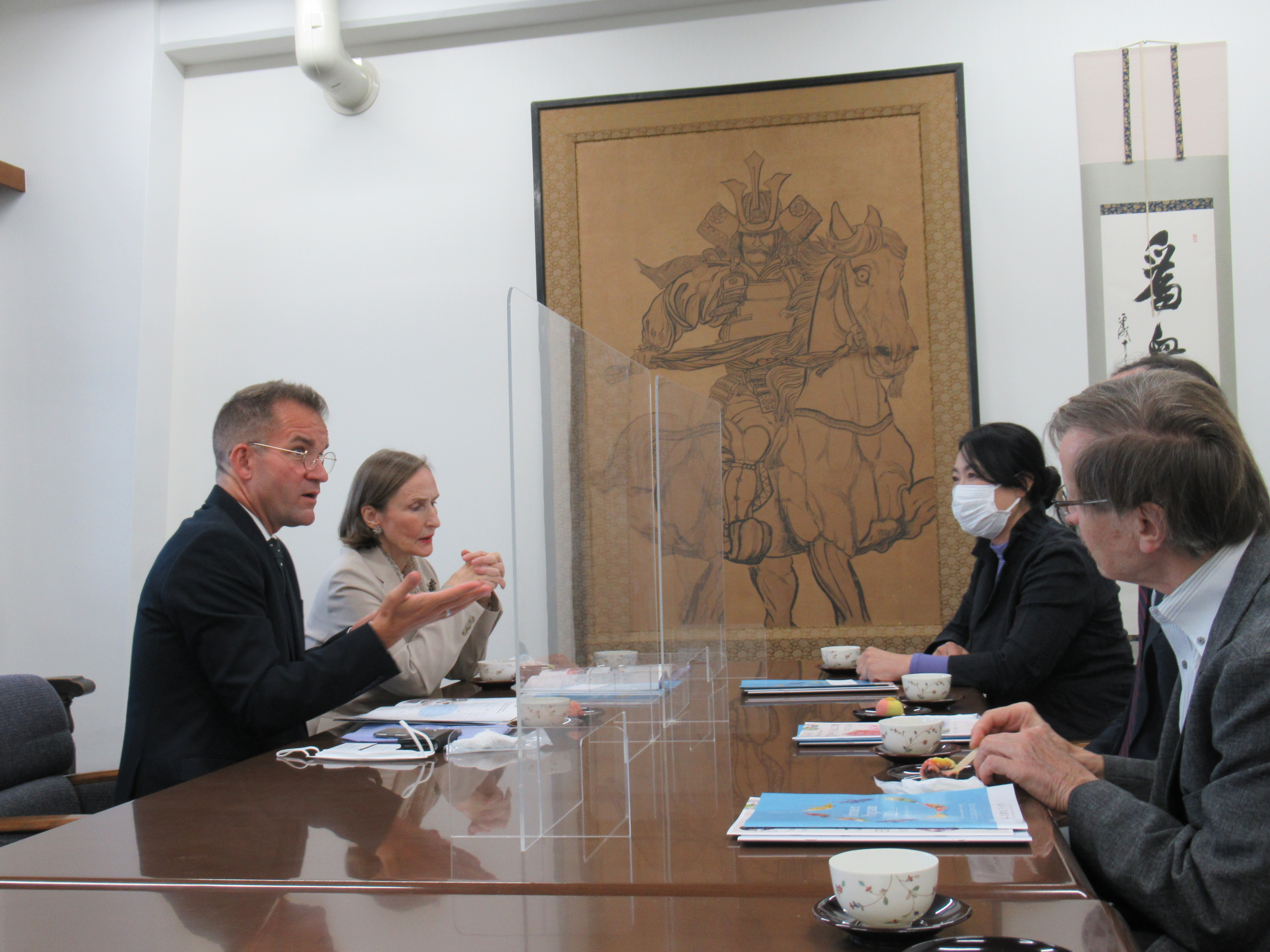 10月6日(木)、オーストリア大使のエリザベート・ベルタニョーリ氏、及び「ドイツ語俳句コンテスト」に対して、長年協賛していただいているオーストリア文化フォーラムのマリオ・フィールグラーダー所長(オーストリア大使館の公使を兼任)が本学を訪問されました。