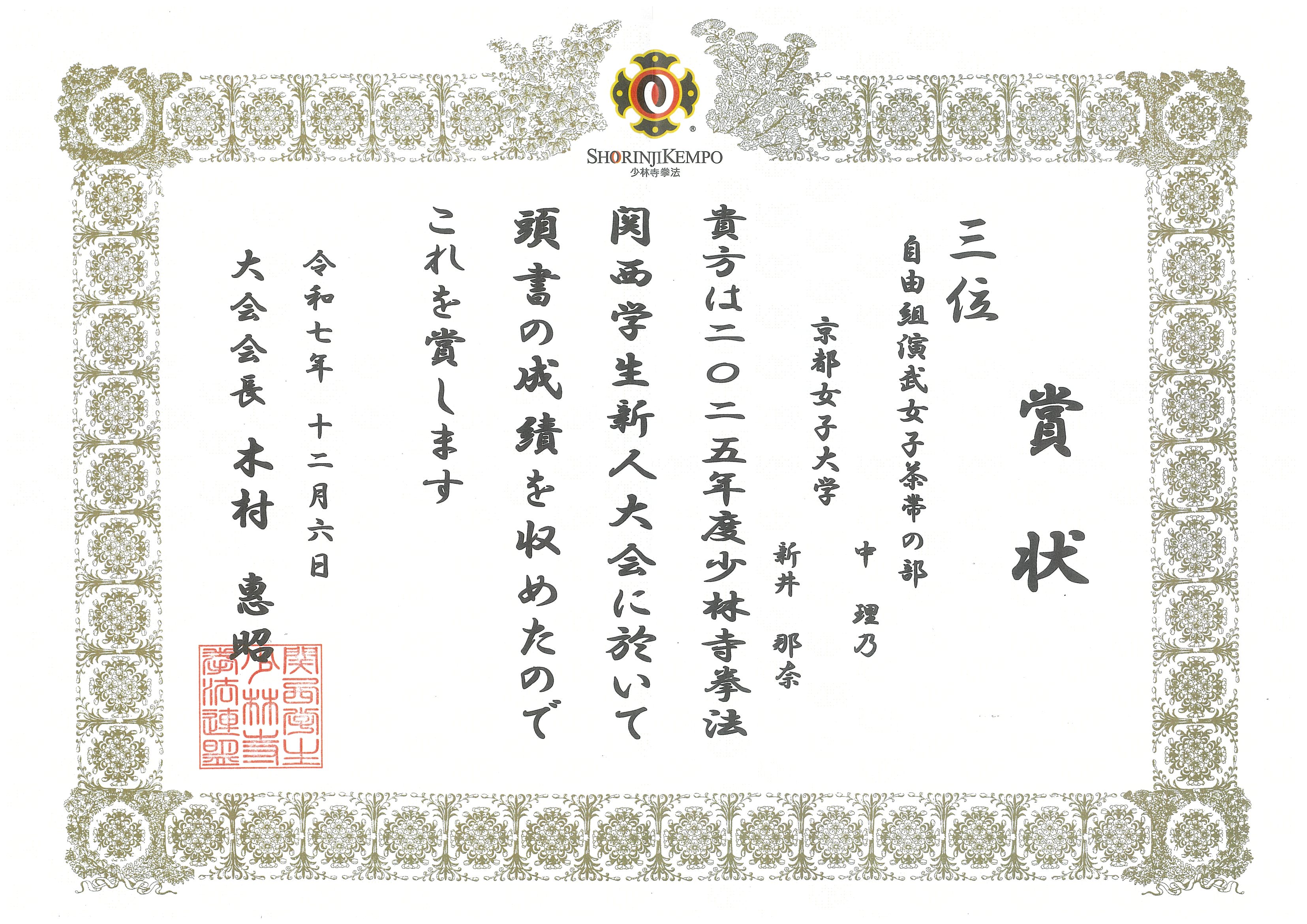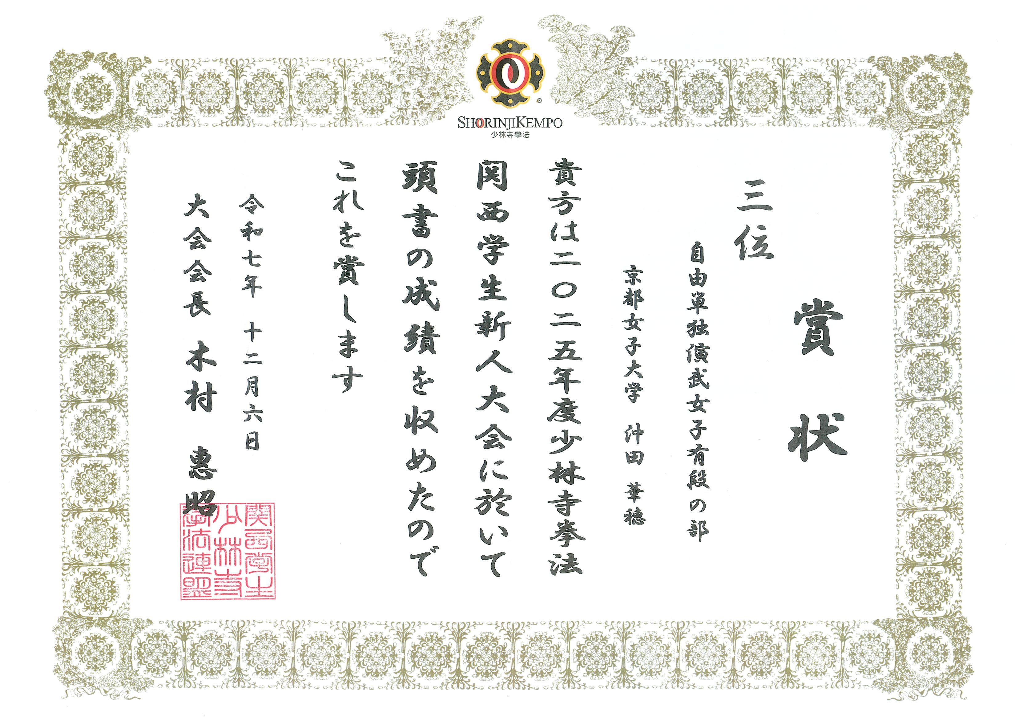 クラブ生コメント「関西学生新人大会でこのような成績を収めることができたのは、いつも応援してくれる方々のおかげです。本当にありがとうございました。これからの頑張ってまいりますので、京都女子大学少林寺拳法部をよろしくお願いいたします。(沖田)